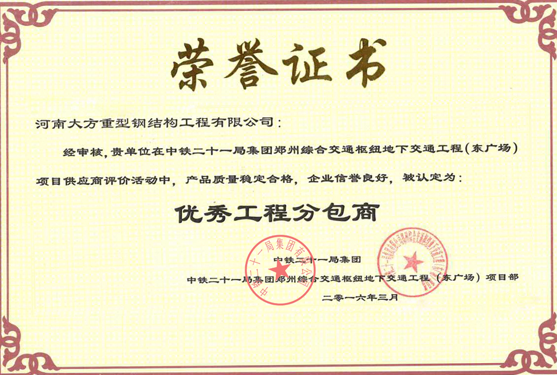 近日,從中鐵二十一局傳來喜訊,在鄭州綜合交通樞紐地下交通工程(東廣場)項目分包商評估活動中,河南大方重型鋼結(jié)構(gòu)工程有限公司因產(chǎn)品質(zhì)量穩(wěn)定合格、交付及時,企業(yè)信譽良好,提供優(yōu)質(zhì)服務(wù)被認(rèn)定為“優(yōu)秀工程分包商”。此項榮譽的獲得肯定了大方鋼構(gòu)在鄭州綜合交通樞紐地下交通工程(東廣場)項目中做出的積極貢獻(xiàn),也充分證明了中鐵二十一局集團(tuán)對大方鋼構(gòu)公司的信任。