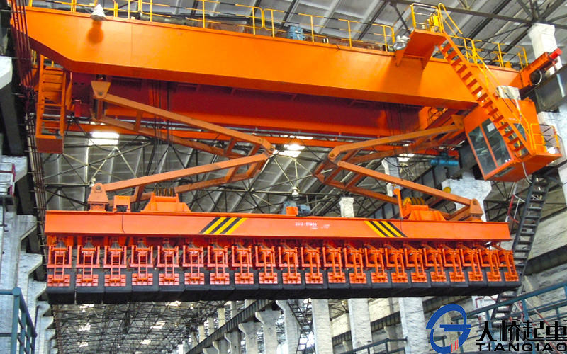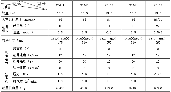 該機由機械、電氣控制系統(tǒng)、氣動系統(tǒng)等部分組成,**套裝置可夾取陽極炭塊10塊,堆積6層;第二套裝置掛在橋架下部工字梁上的電動葫蘆,該電動葫蘆可沿工字鋼軌道移動,其吊鉤可用于車間內(nèi)的單塊零星物品吊運工作。夾具裝置上的夾鉗打開和夾持動作都由氣動系統(tǒng)提供動力,起重機全部動作均可在操縱室內(nèi)完成。