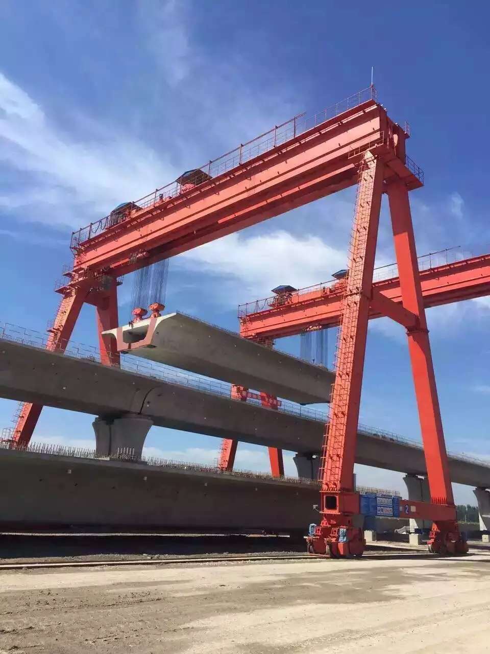 該設(shè)備既可兩臺配合抬吊預(yù)制梁,也可以單臺起重機(jī)配雙吊具起吊預(yù)制梁,兩臺同時起重的提梁機(jī)各自的起重量一般為450噸,單臺起重的提梁機(jī)起重量通常可達(dá)900噸。它配置支腿行走、天車行走及天車起吊設(shè)備,可以實現(xiàn)全方位機(jī)械化動作。主要用于將預(yù)制梁從制梁臺提吊至存梁臺位,預(yù)制梁養(yǎng)護(hù)完成后將其從存梁臺位吊運(yùn)到運(yùn)梁車上。作為起重設(shè)備完成架橋機(jī)的組裝和拆卸。還用于架設(shè)墩身不高的旱橋。