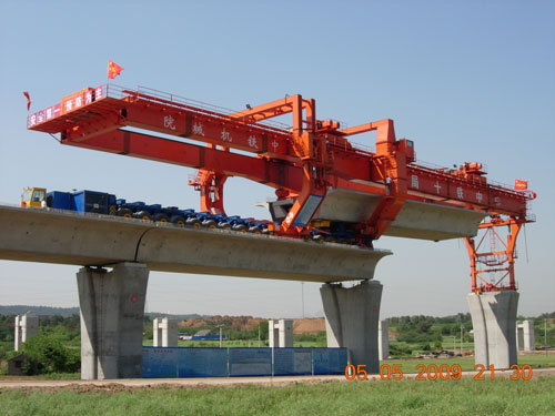 JQ900A型架橋機架梁作業(yè)為跨一孔簡支式架梁,由YL900型運梁車運梁至架橋機尾部喂梁,起重小車吊梁拖拉取梁,空中微調(diào)箱梁位置就位,架橋機采用液壓驅(qū)動輪胎走行,步履縱移過孔作業(yè)方式。可以架設(shè)32m、24m、20m雙線整孔箱梁,適應(yīng)架設(shè)曲線半徑R5500m,適應(yīng)架設(shè)縱坡20‰,額定起重量900t。